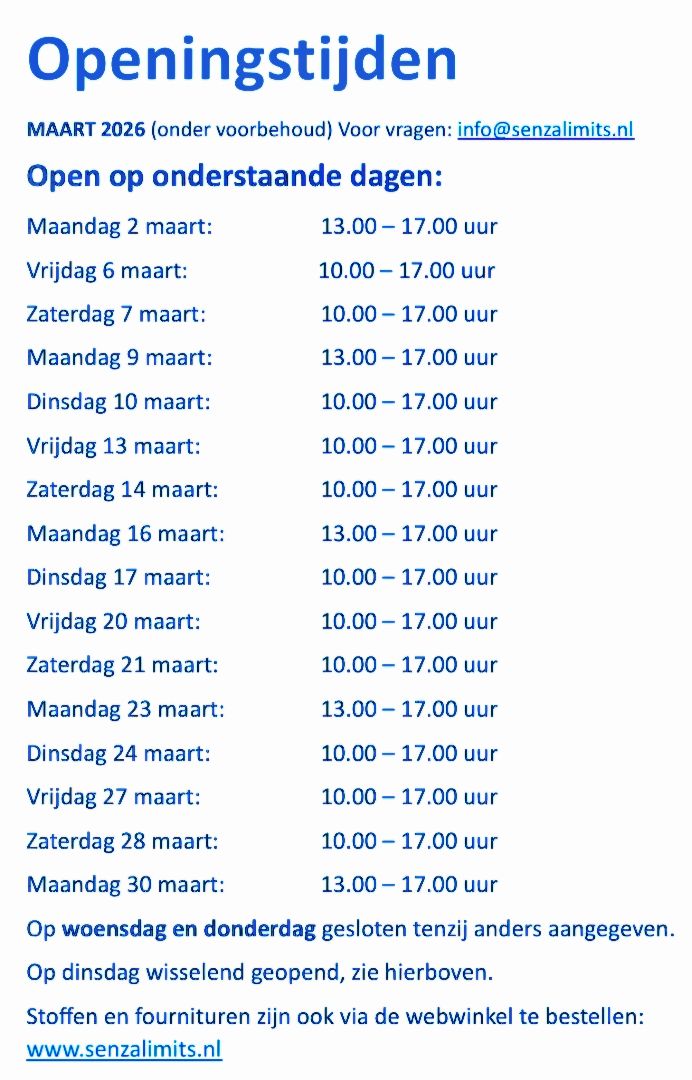 Aanmelden kan via info@senzalimits.nl of kom langs in de winkel.