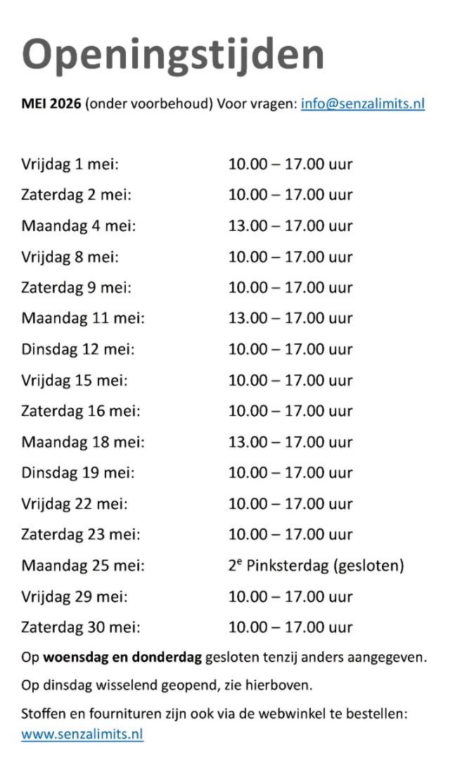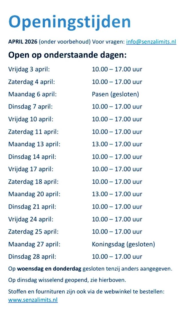 Aanmelden kan alleen via info@senzalimits.nl of kom langs in de winkel.
