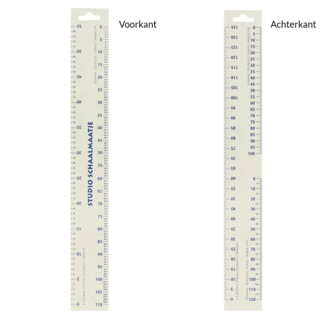 De liniaal heeft 3 schalen aan de ene kant (1:4, 1:2 en 1:5) en twee schalen aan de andere zijde (1:8 en 1:10).