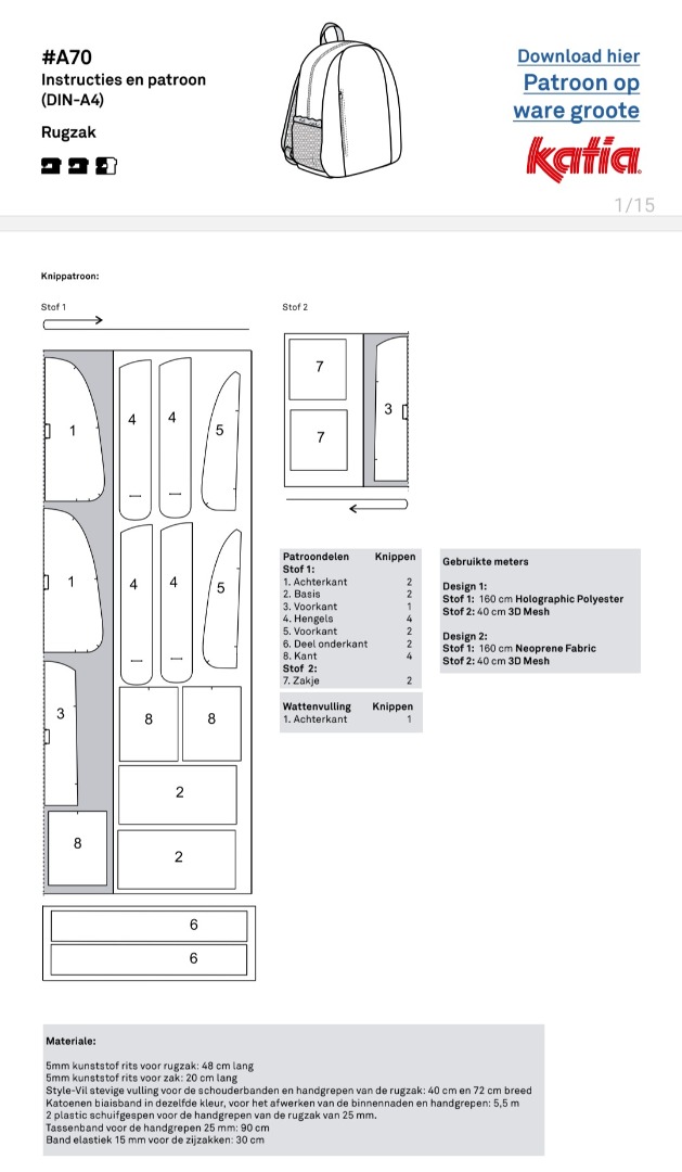 Het patroon van de rugtas staat als pdf patroon in de het Unplugged tijdschrift, zie de laatste foto voor de benodigde materialen