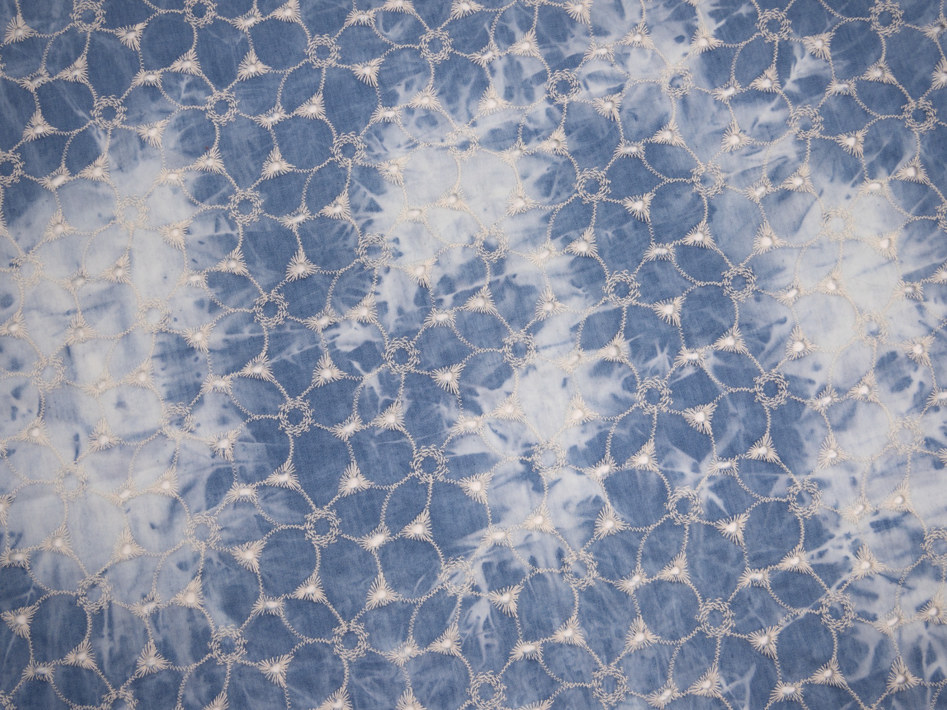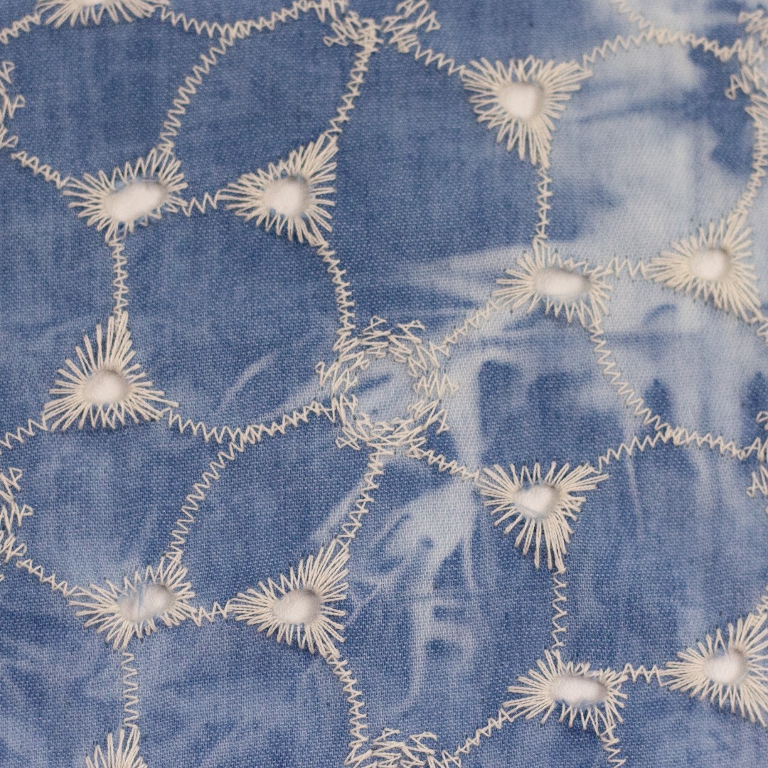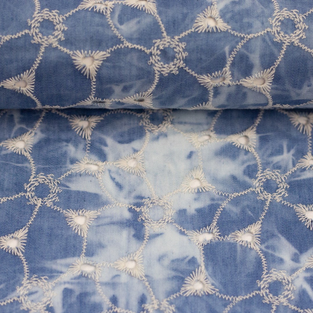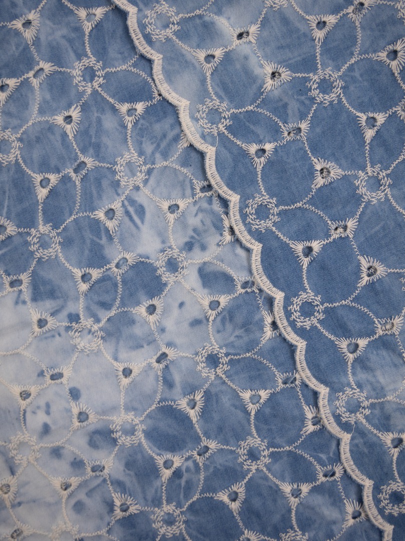 Een katoen met geborduurde bloemen, met aan kant een geschulpte rand