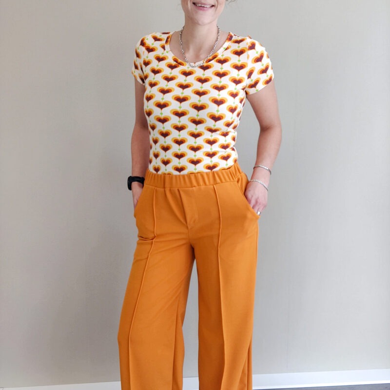Kies bijvoorbeeld voor licht rekbare corduroy, rekbare denim, scuba crêpe, scuba crêpe twill, stretch satijn, … Dit patroon is geschikt voor beginnende en gevorderde naaisters :-).