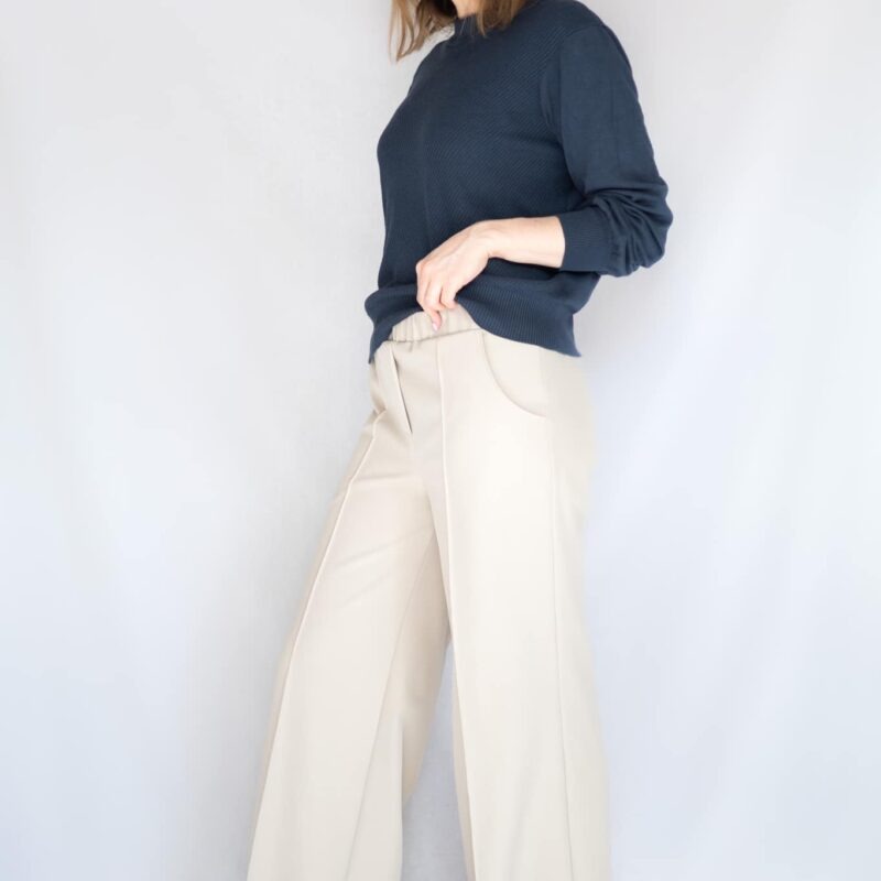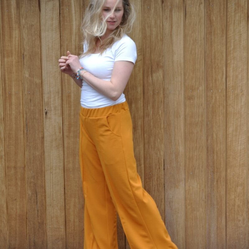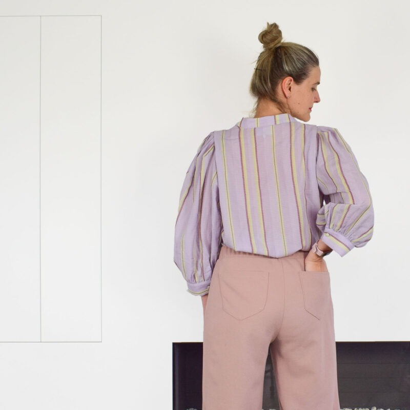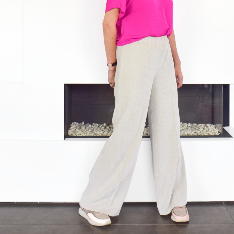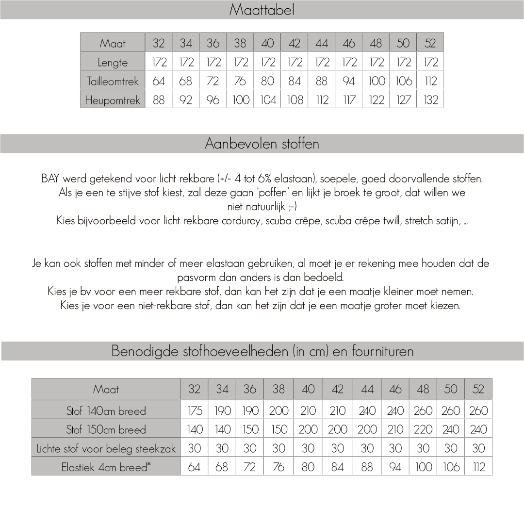 Over het Bay broek patroon: Bay is een comfortabele broek met wijde, losse pijpen. Op het voorpand kan je de kenmerkende lengtenaad stikken voor een extra accent. Verder kan je kiezen voor een valse gulp en optioneel kan je steekzakken en achterzakken toevoegen. De broek wordt simpel afwerkt met tailleband en elastiek. BAY werd getekend voor licht rekbare (+/- 4 tot 6% elastaan), soepele, goed doorvallende stoffen. Als je een te stijve stof kiest, zal deze gaan ‘poffen’ en lijkt je broek te groot, dat willen we niet natuurlijk ????