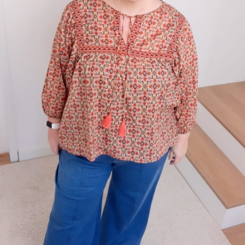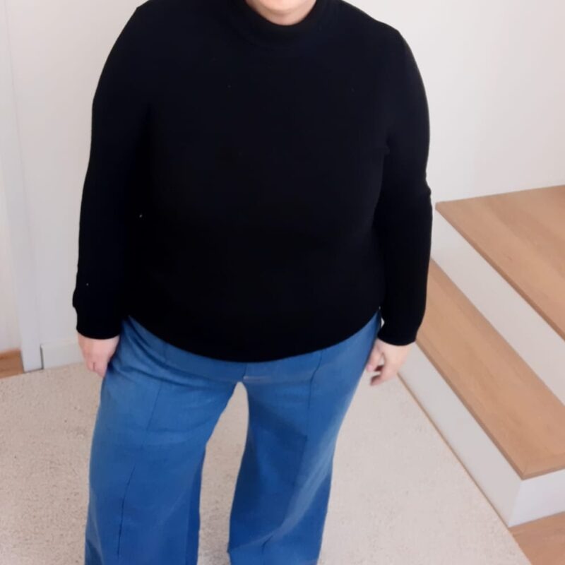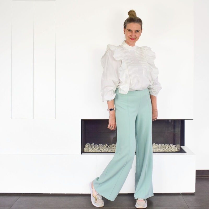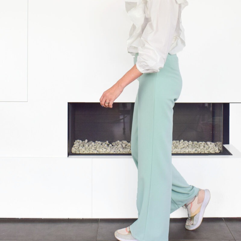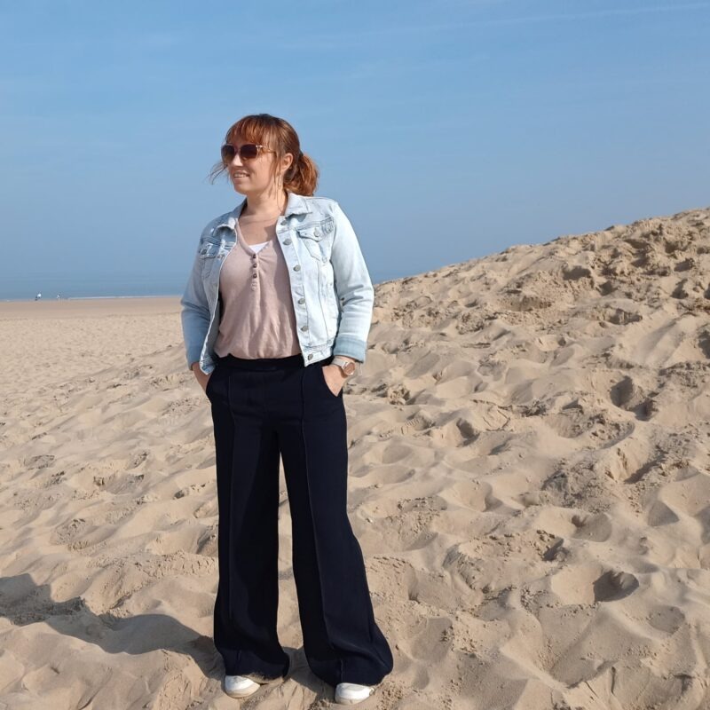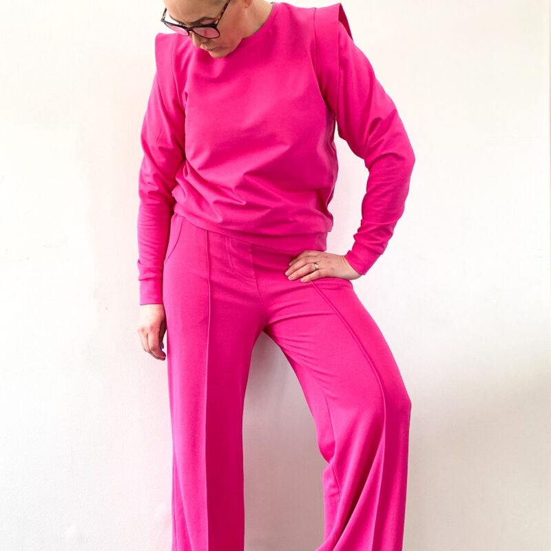 Over het Bay broek patroon: Bay is een comfortabele broek met wijde, losse pijpen. Op het voorpand kan je de kenmerkende lengtenaad stikken voor een extra accent. Verder kan je kiezen voor een valse gulp en optioneel kan je steekzakken en achterzakken toevoegen. De broek wordt simpel afwerkt met tailleband en elastiek. BAY werd getekend voor licht rekbare (+/- 4 tot 6% elastaan), soepele, goed doorvallende stoffen. Als je een te stijve stof kiest, zal deze gaan ‘poffen’ en lijkt je broek te groot, dat willen we niet natuurlijk ????