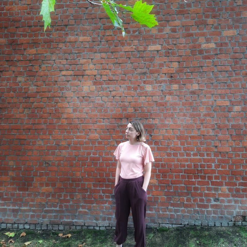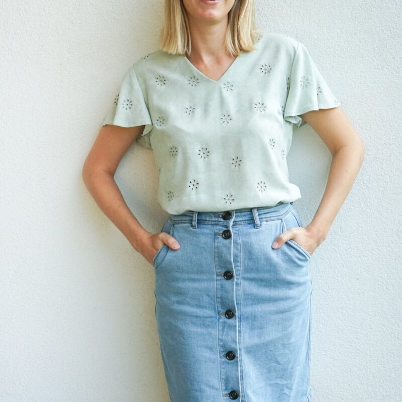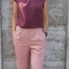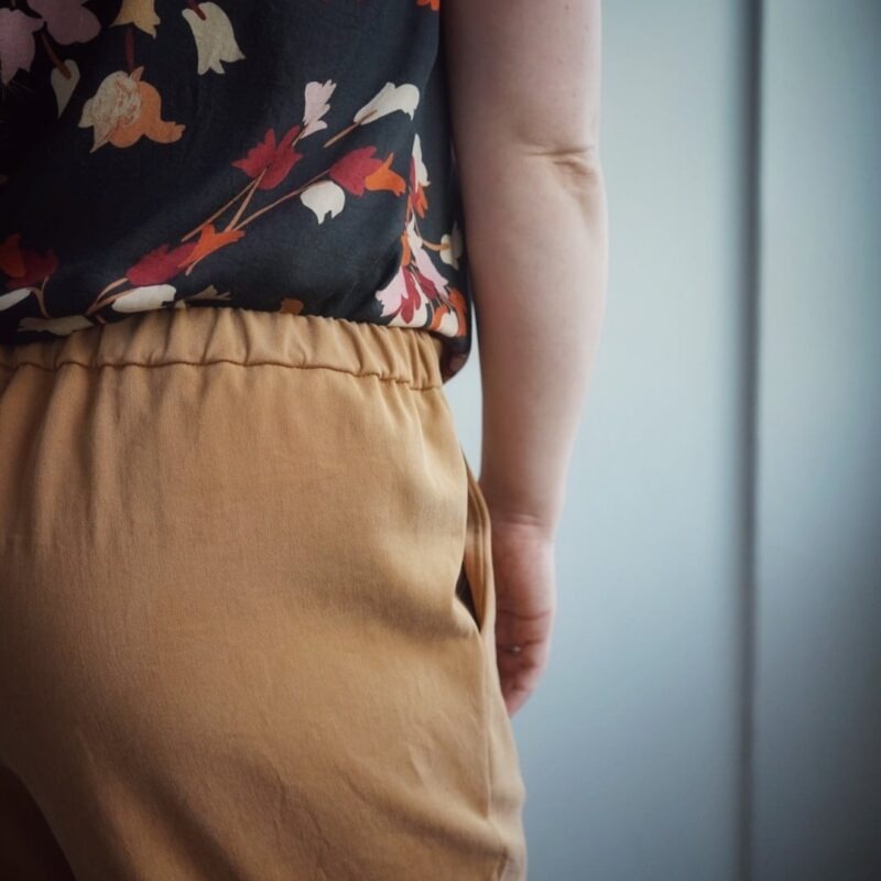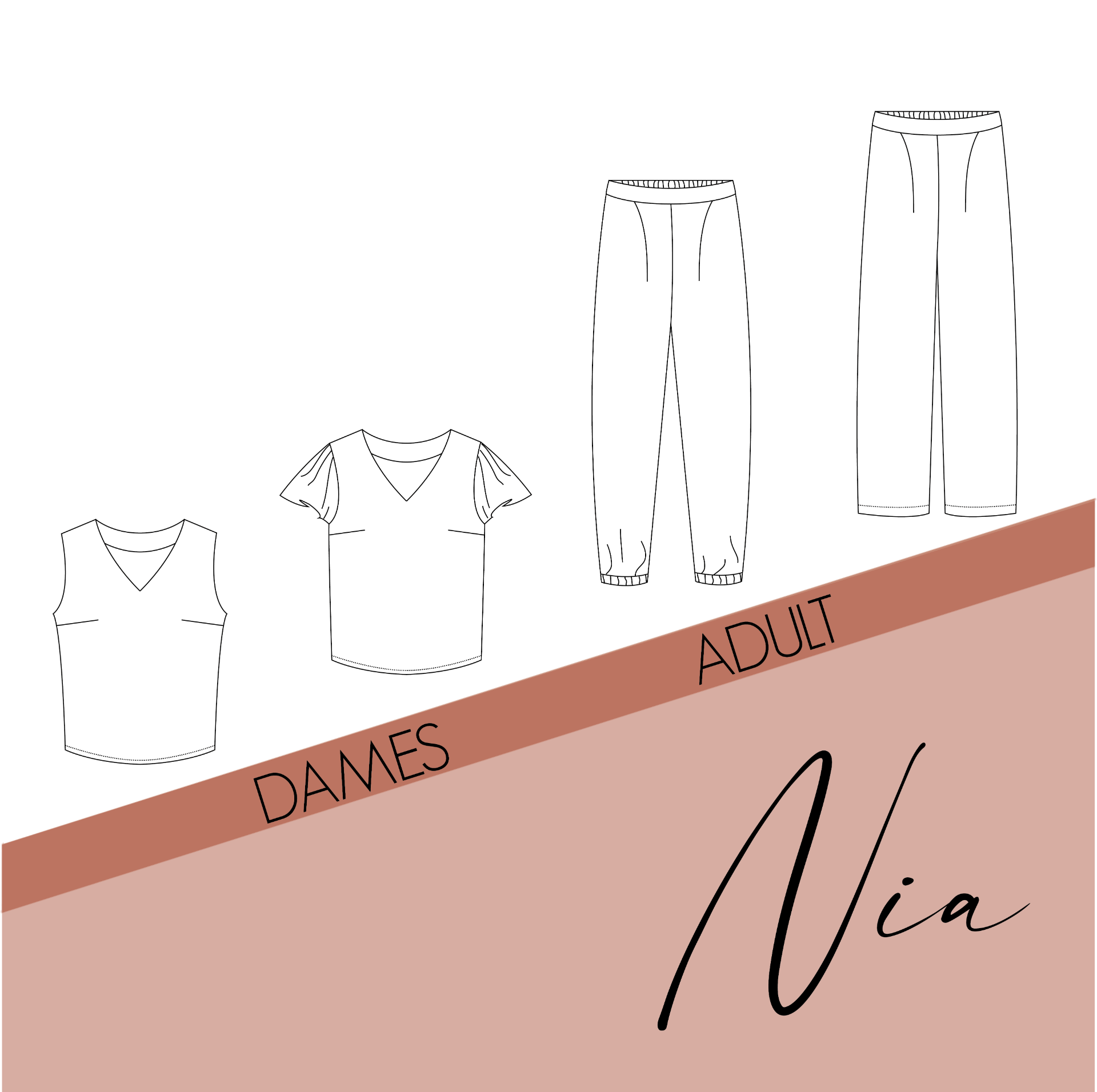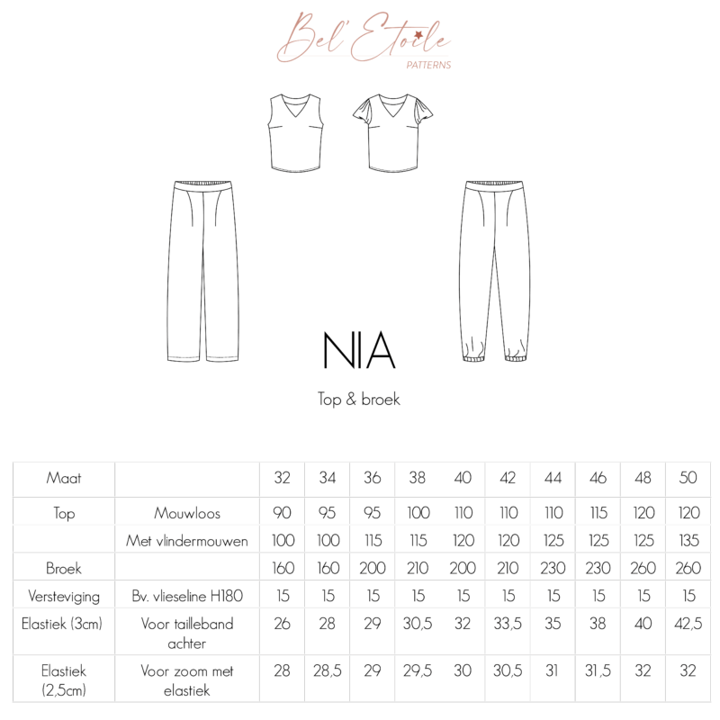 Nia is een combinatie van een losvallend topje met borstnepen (coupenaden) en een stijlvolle, comfortabele broek. De broek heeft een plooi vooraan, een platte tailleband, en elastiek in de tailleband achteraan. Je kan de zoom van de broek afwerken op de klassieke manier of met elastiek in de zoom. De armsgaten van het topje werk je af met een beleg of met een vlindermouw. De Nia top werd getekend voor soepele, niet rekbare stoffen, kies hier bijvoorbeeld voor viscose, crêpe, tencel, … De Nia broek werd getekend voor geweven stoffen die mooi doorvallen, denk daarbij aan tencel, tencel twill, viscose, ..