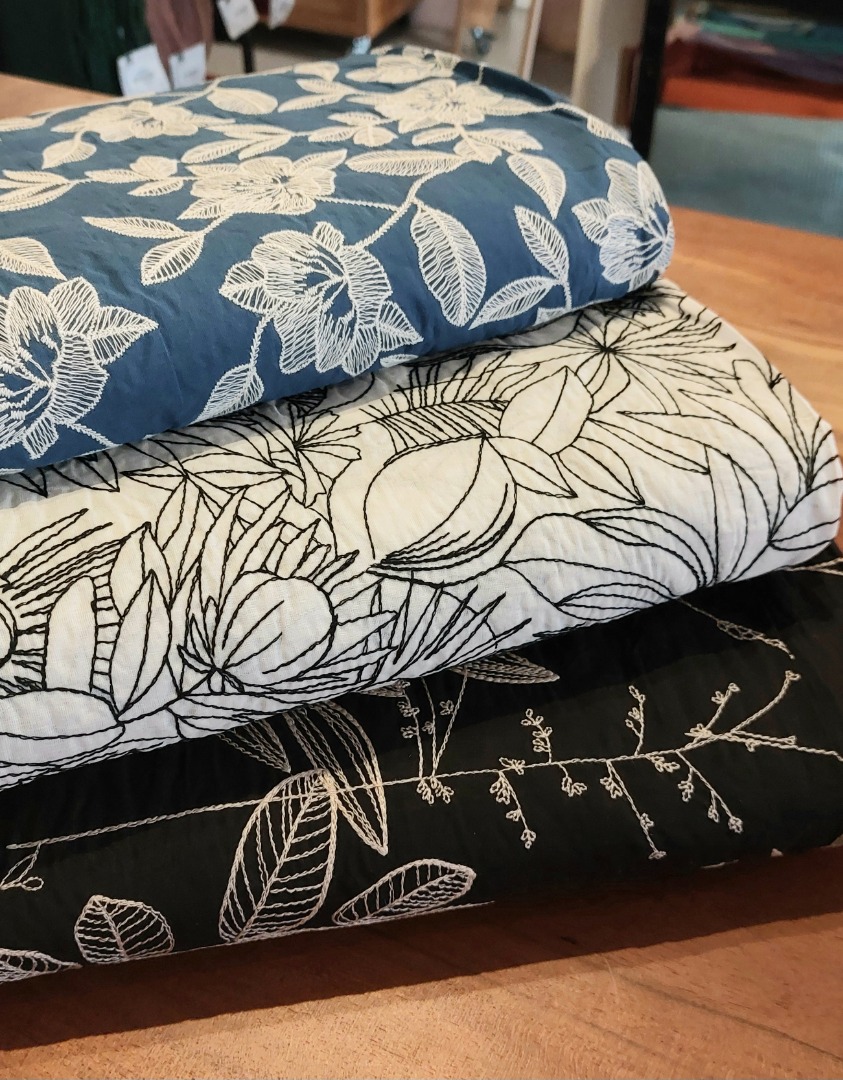 Geef je kleding een moderne en ambachtelijke uitstraling met Embroidery Jeans & White, een voile stof in denimblauw met witte geborduurde bloemmotieven. De lichte valling en geborduurde afwerking maken het perfect voor luchtige overhemden, zwierige jurken, rokken en kaftans – ideaal voor het voorjaars- en zomerseizoen.
