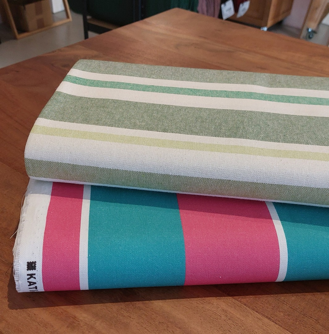Canvas is niet alleen geschikt voor tassen en accessoires maar zeker ook voor jassen en broeken Kies voor Recycled Canvas Stripes Green en geef je creaties een natuurlijke, frisse en bewuste uitstraling.