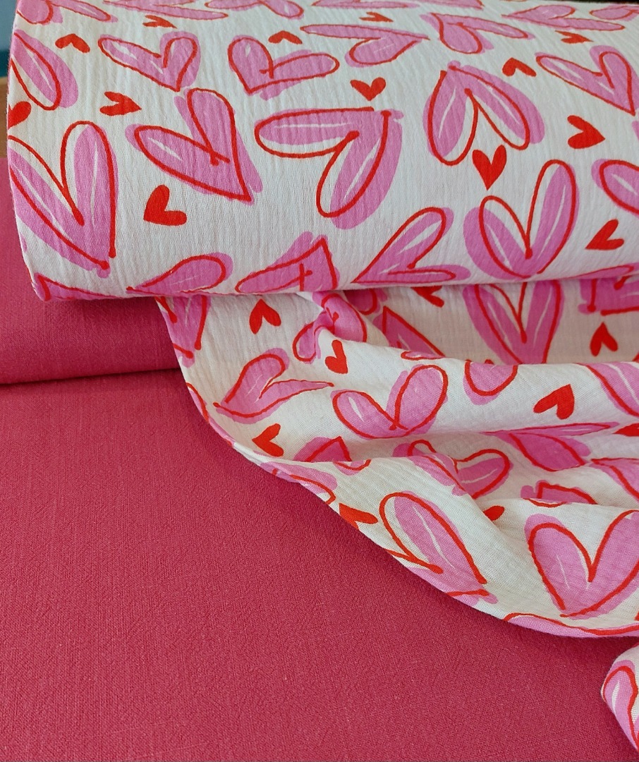 Kleur: rood/roze op gebroken witte ondergrond, de grote harten zijn ca. 6 cm groot , de kleine ca. 1,5 bij 2 cm