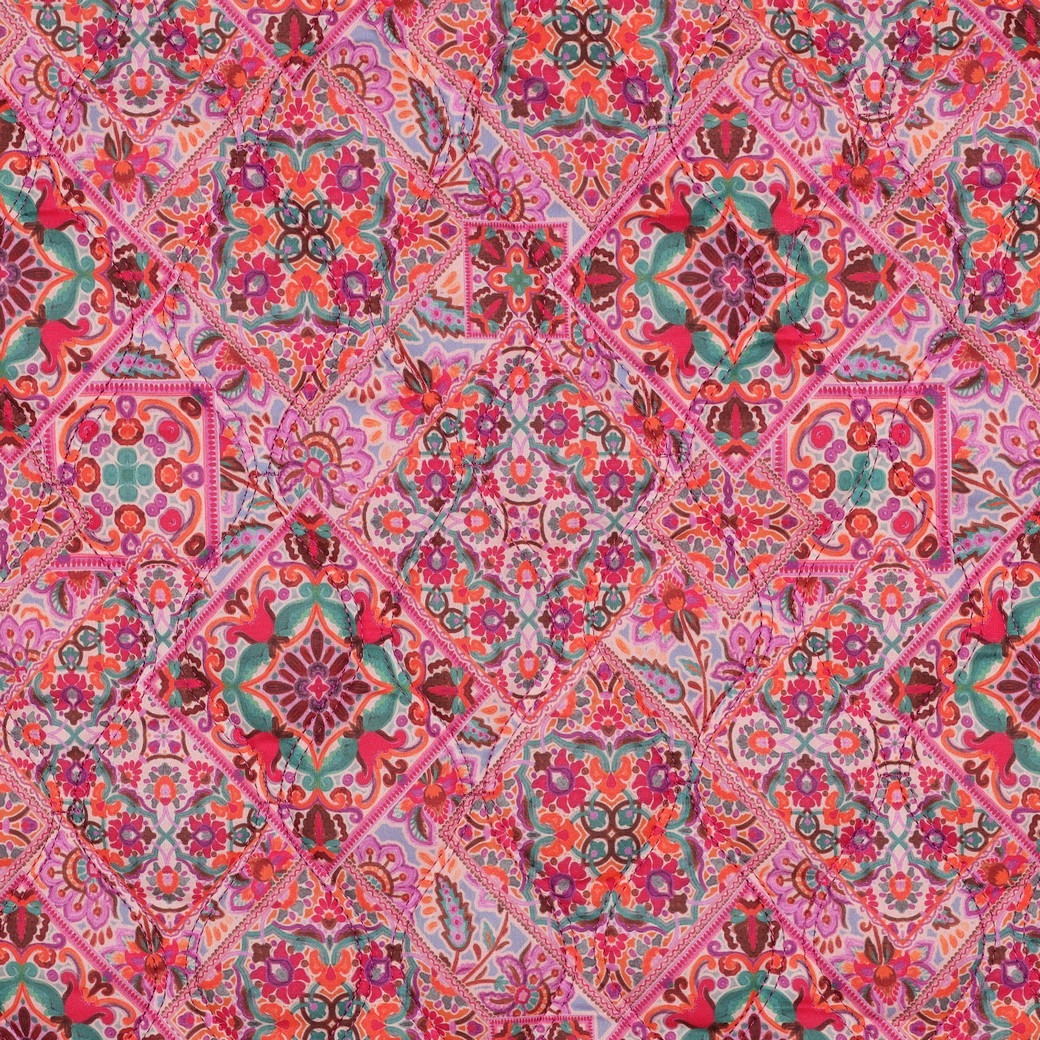 Een mooie gestepte dubbelzijdige (double face) stof met bloemen patchwork aan de ene kant en grafische figuurtjes aan de andere kant