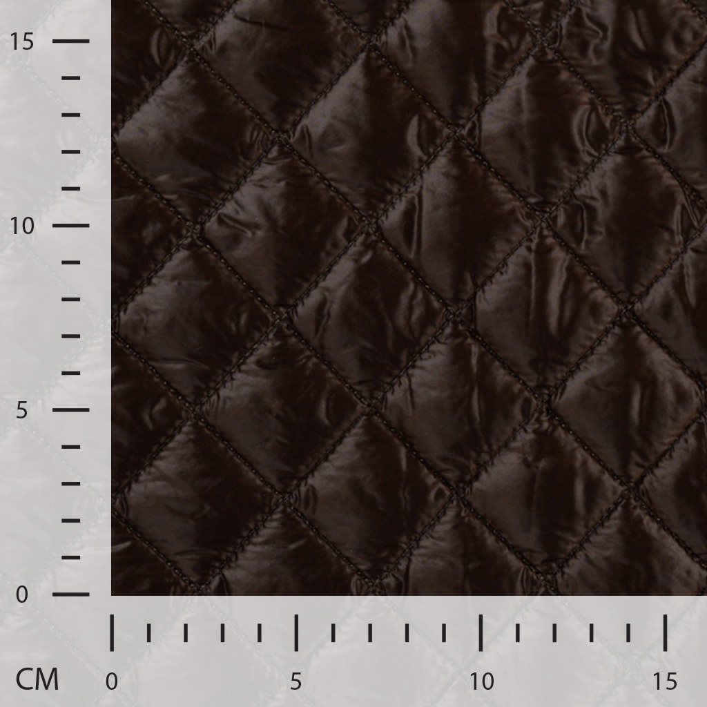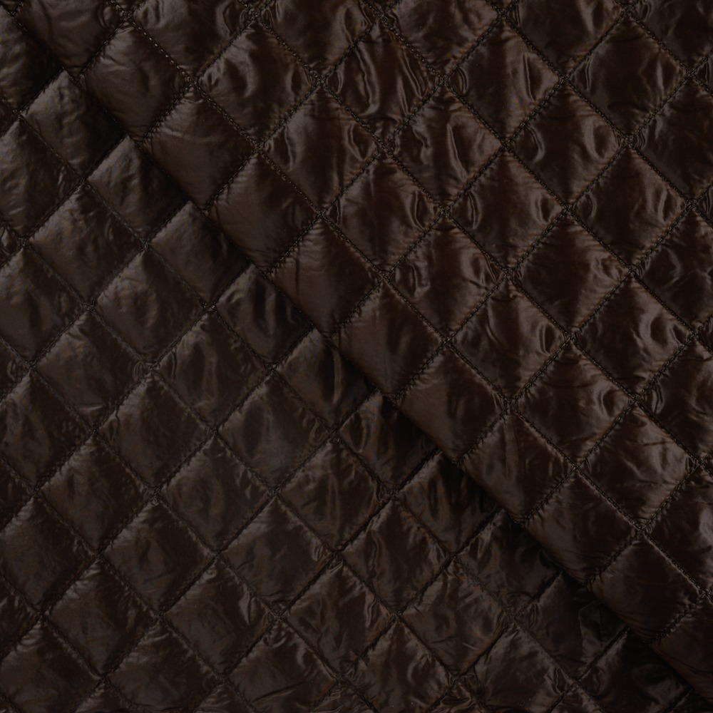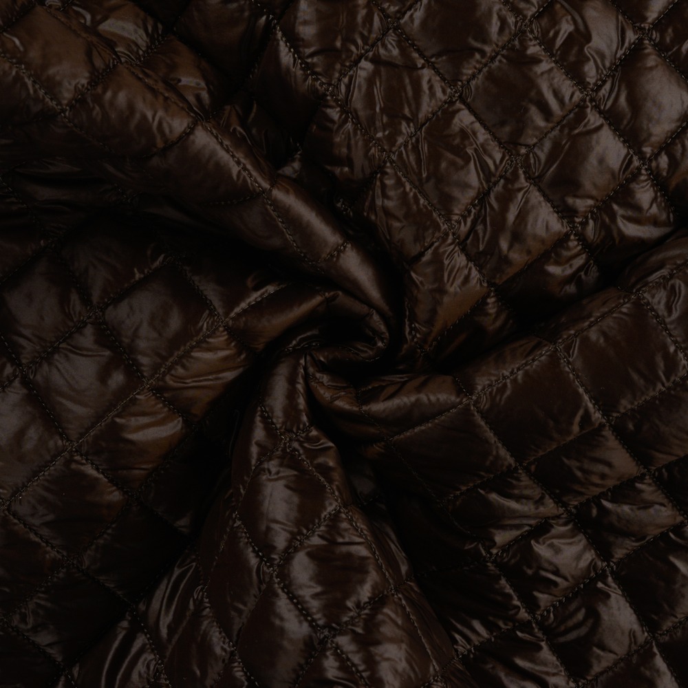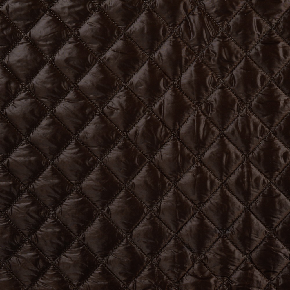 Prachtig geweven gewatteerde stof met een diamantpatroon, met een donkerbruine kleur en een lichte glans.