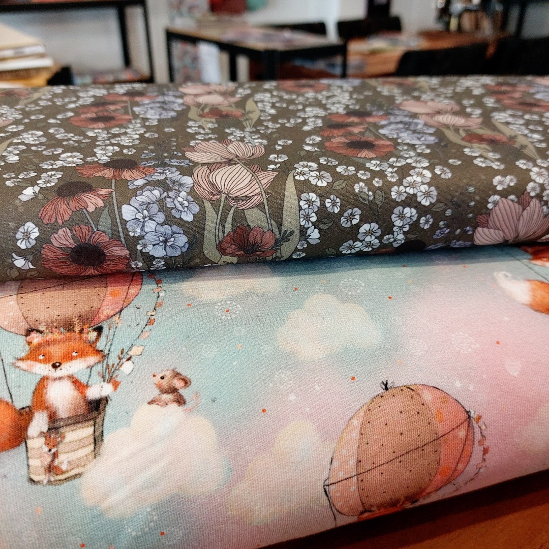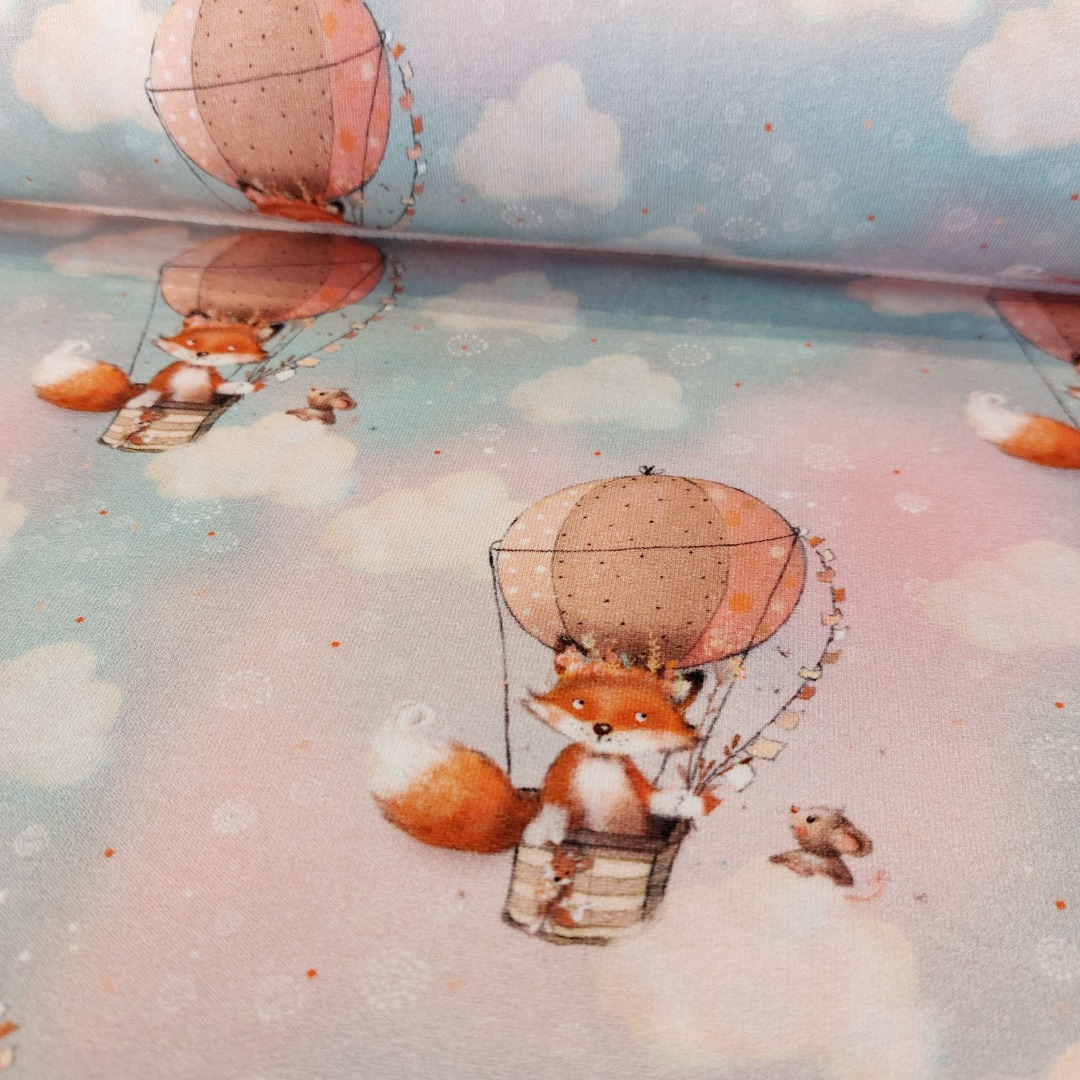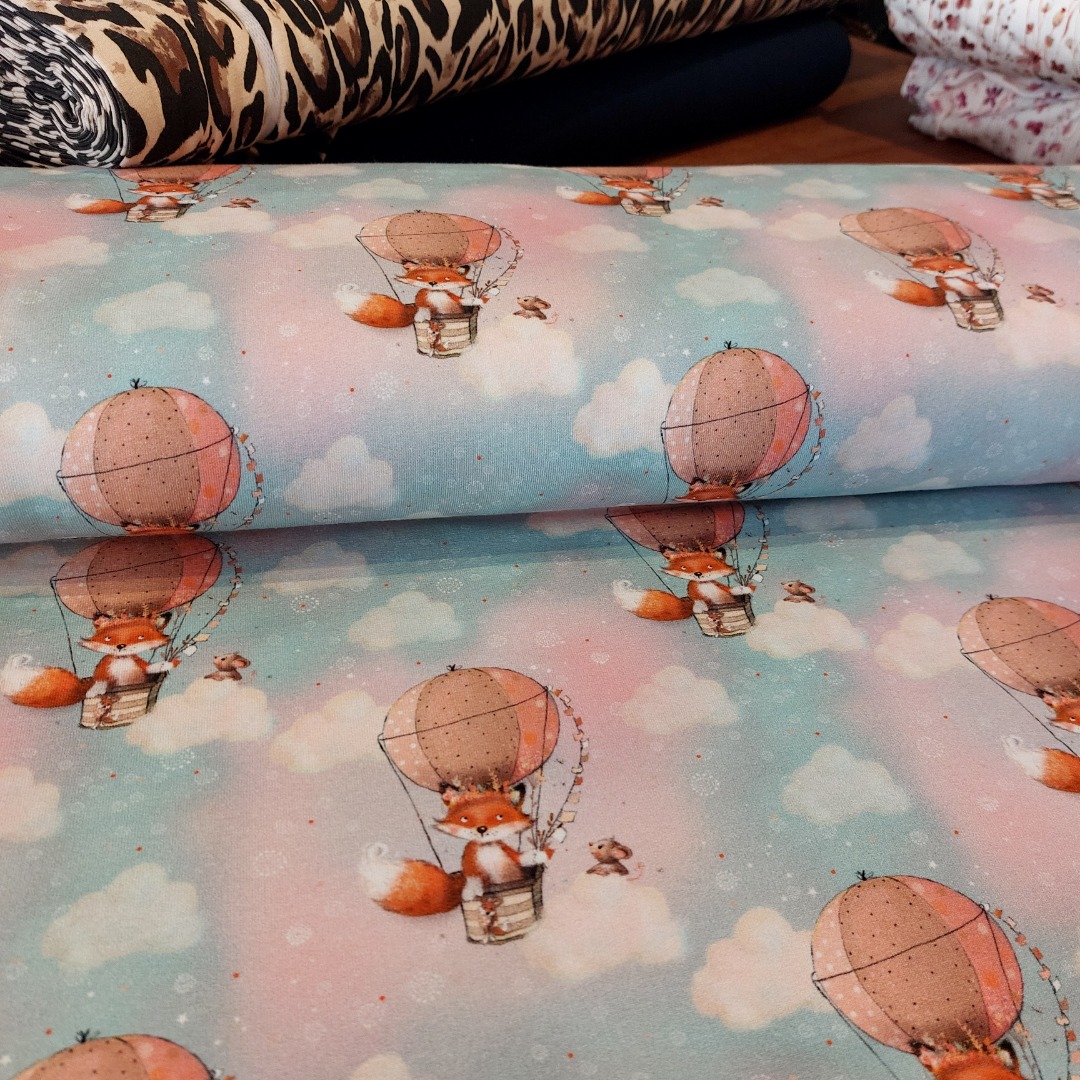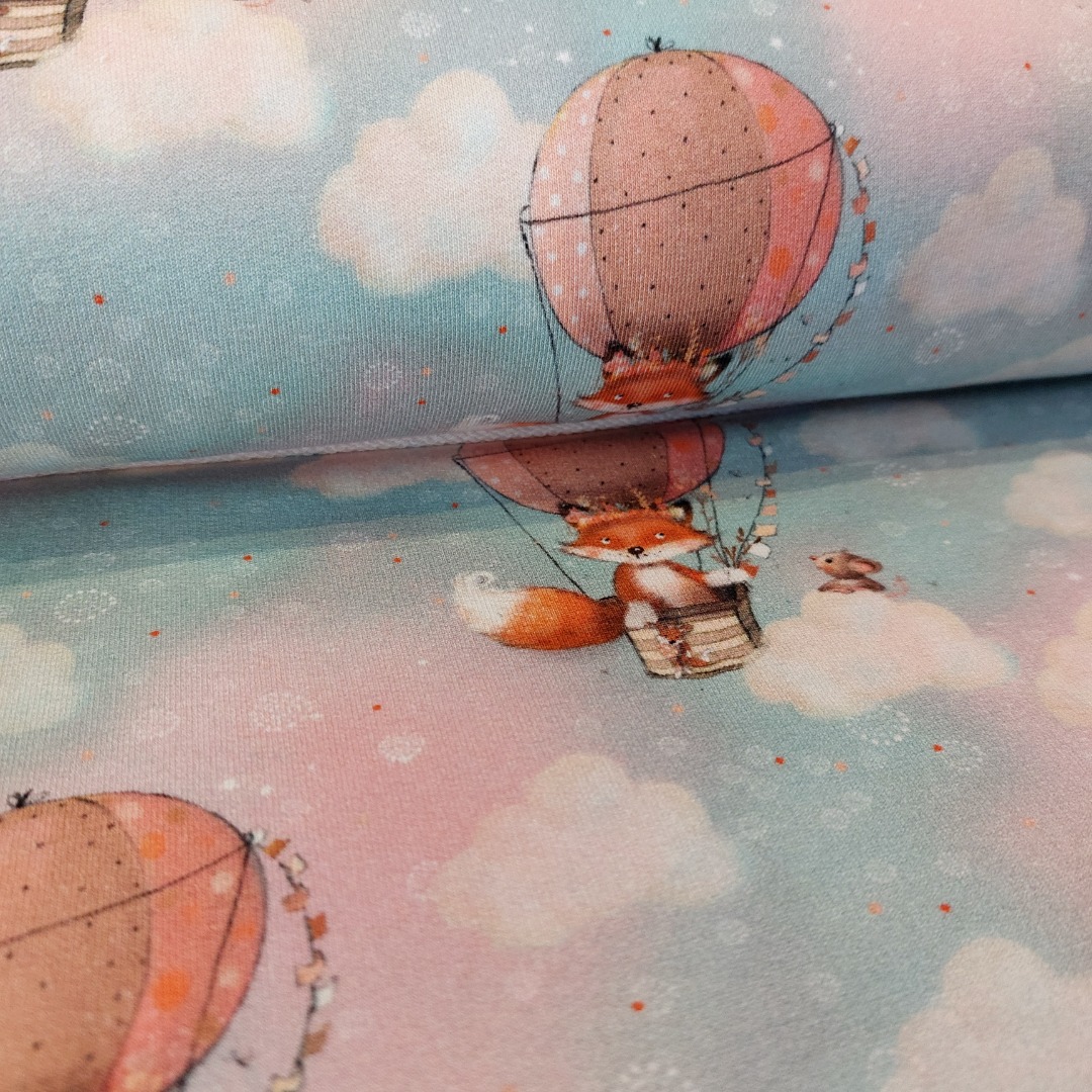 Een mooie kwaliteit french terry met een vosje in een luchtballon en een muisje op een wolkje