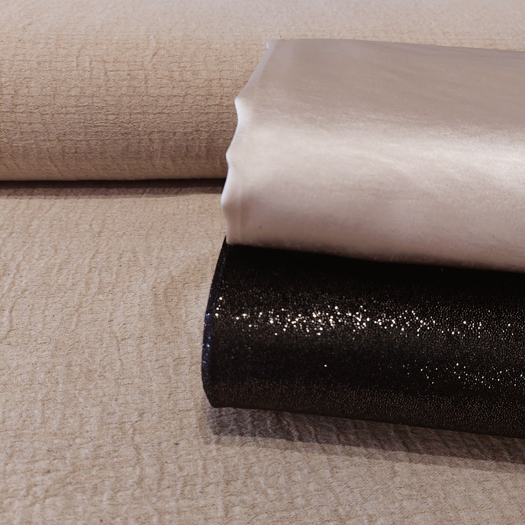 Een verfijnde en veelzijdige stof in satijnweving met een subtiele glans, licht getextureerde materiaal met een delicate uitstraling die doet denken aan dunne katoen- of linnenmengsels.